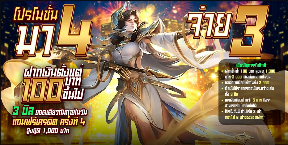 📲 เพียงลูกค้าฝากเงินเข้ามาขั้นต่ำ 100 บาทเล่นเสีย 3 บิล ติดกัน ต้องเป็นยอดเท่ากัน ภายในวัน เราแถมฟรีเครดิตครั้งที่ 4 ทันที